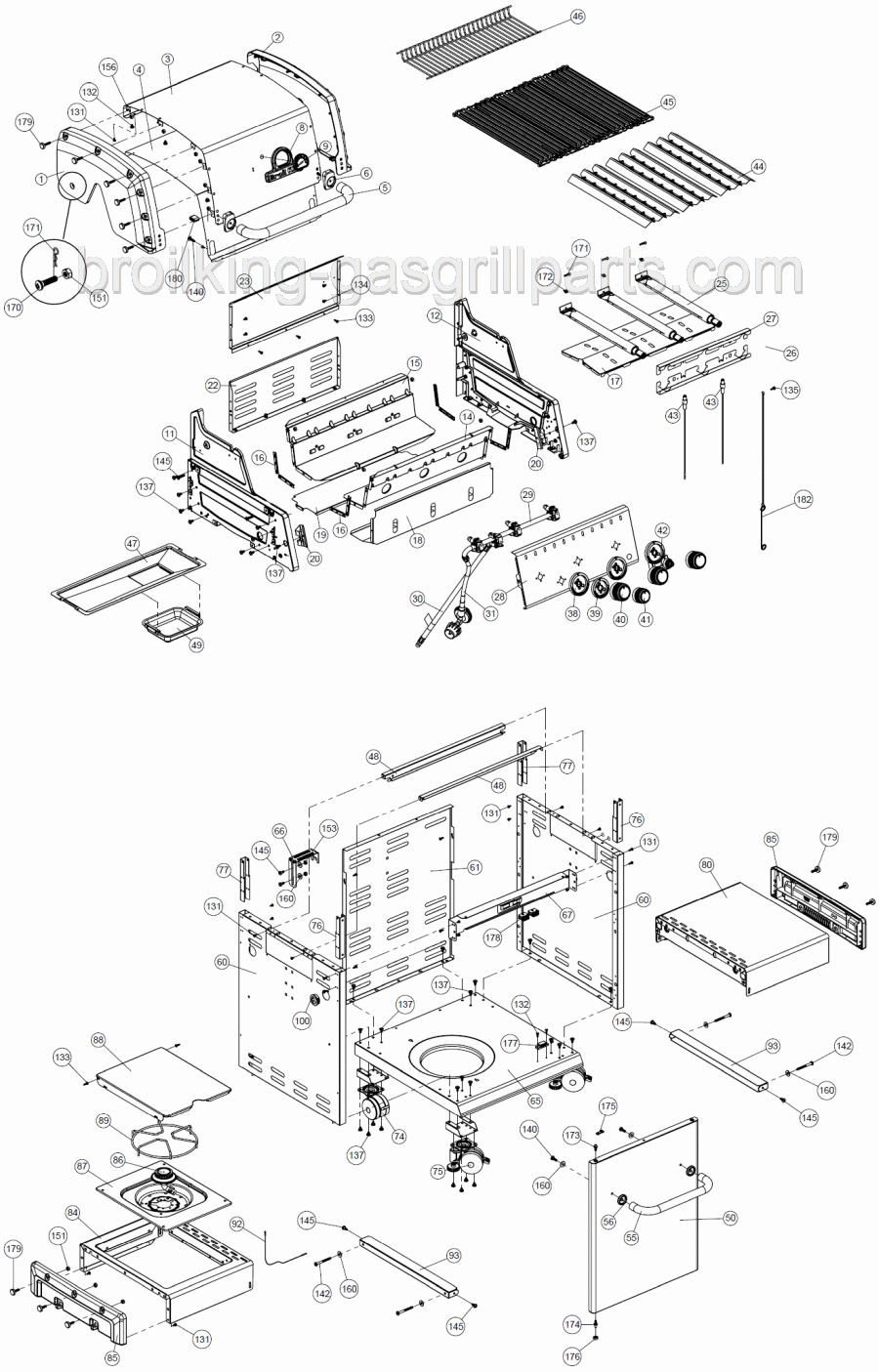 A redesigned one piece upper and lower collector box assembly for Broil King Baron three tube in tube burner grills. T